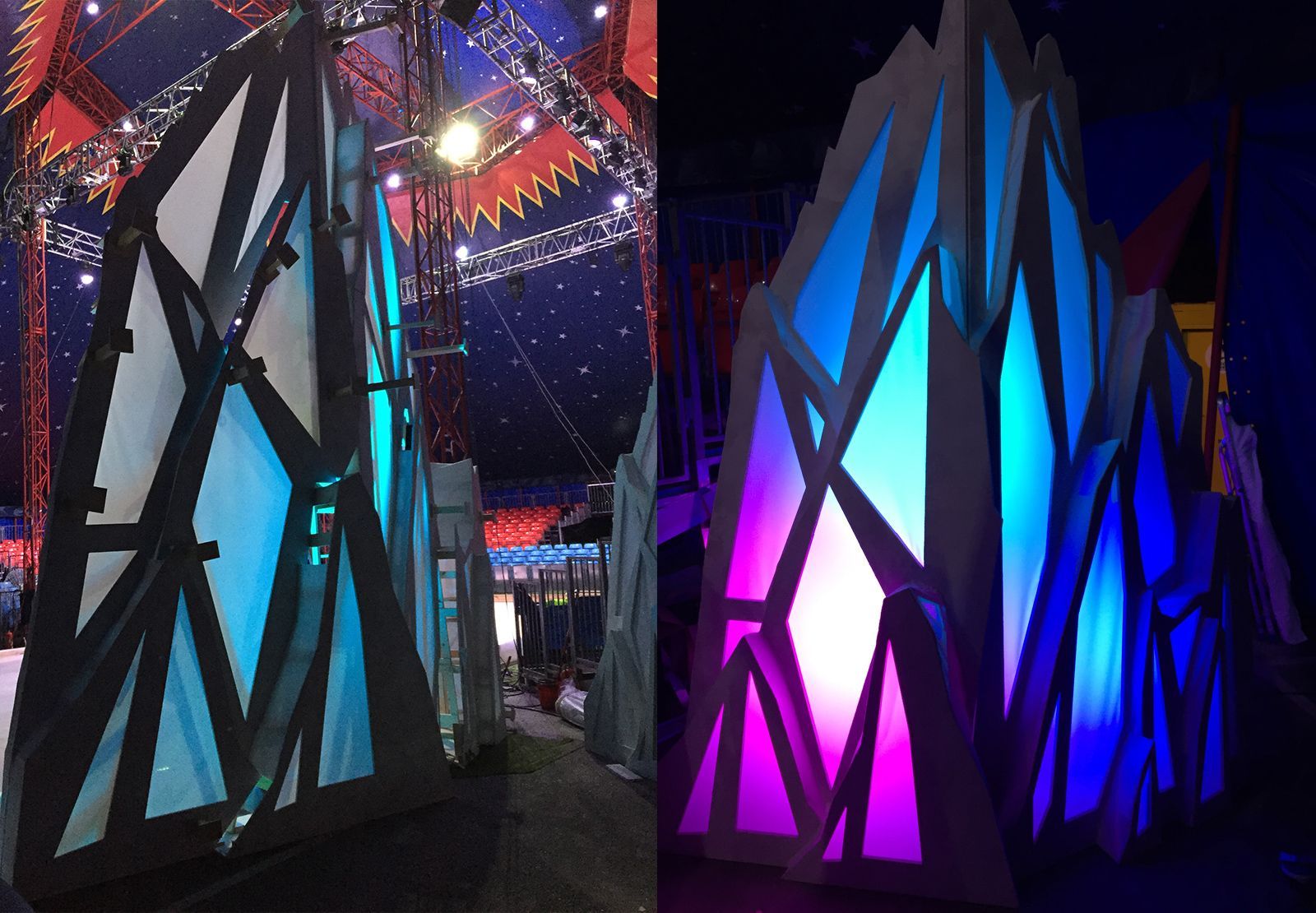 - Lighting integration: Each glacier had to incorporate translucent material sections to allow internal lighting, enabling dynamic colour and atmosphere changes throughout the performance.