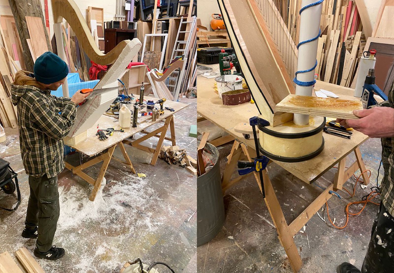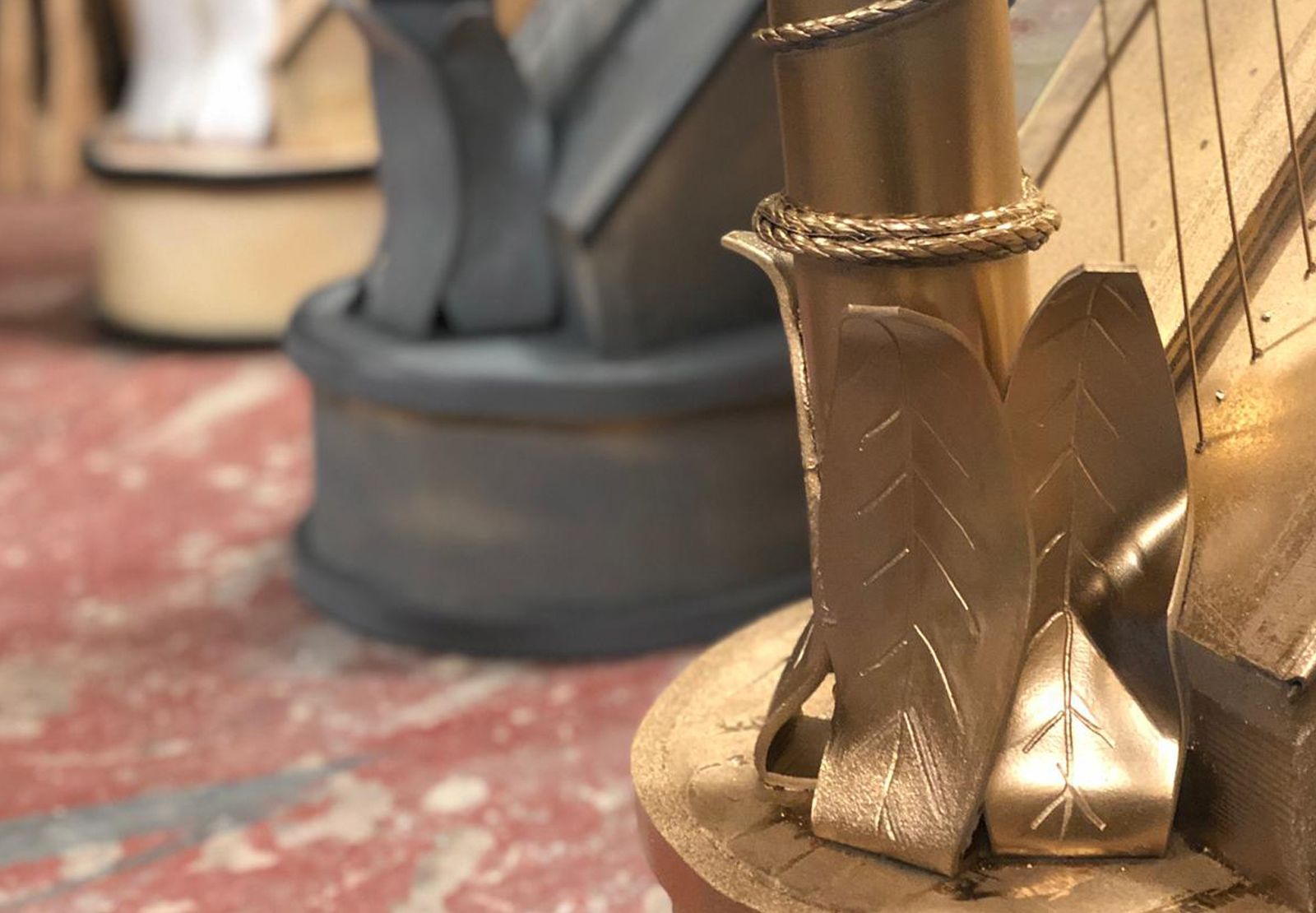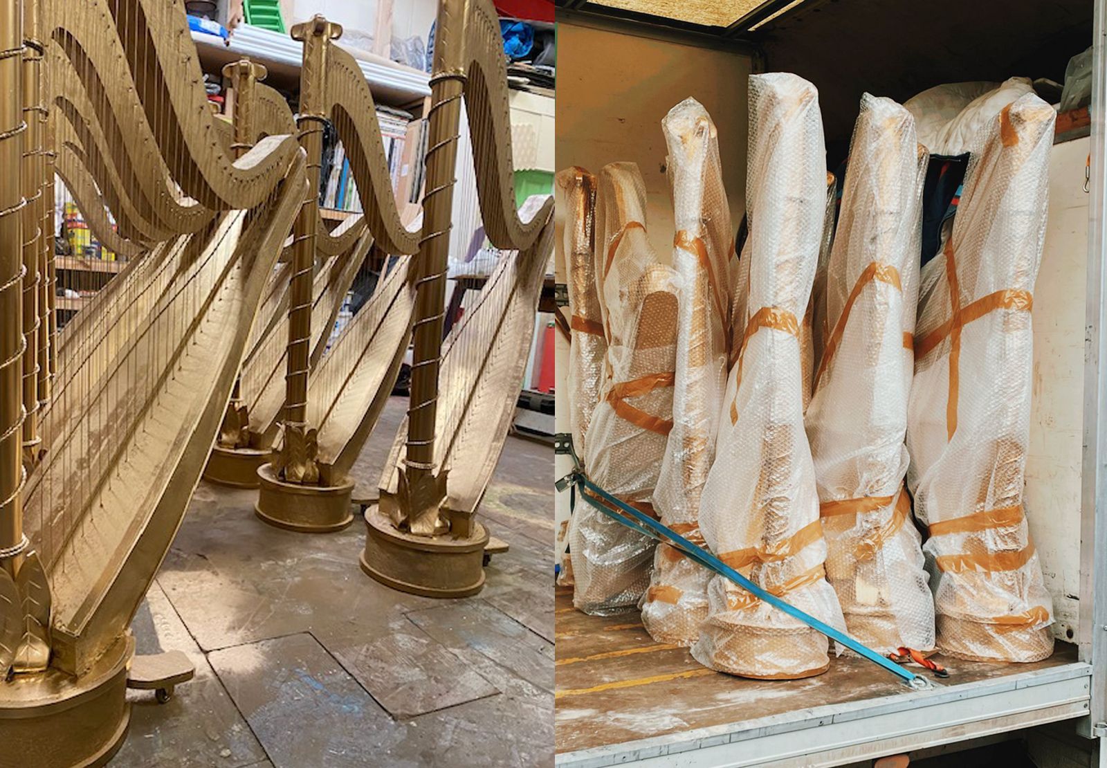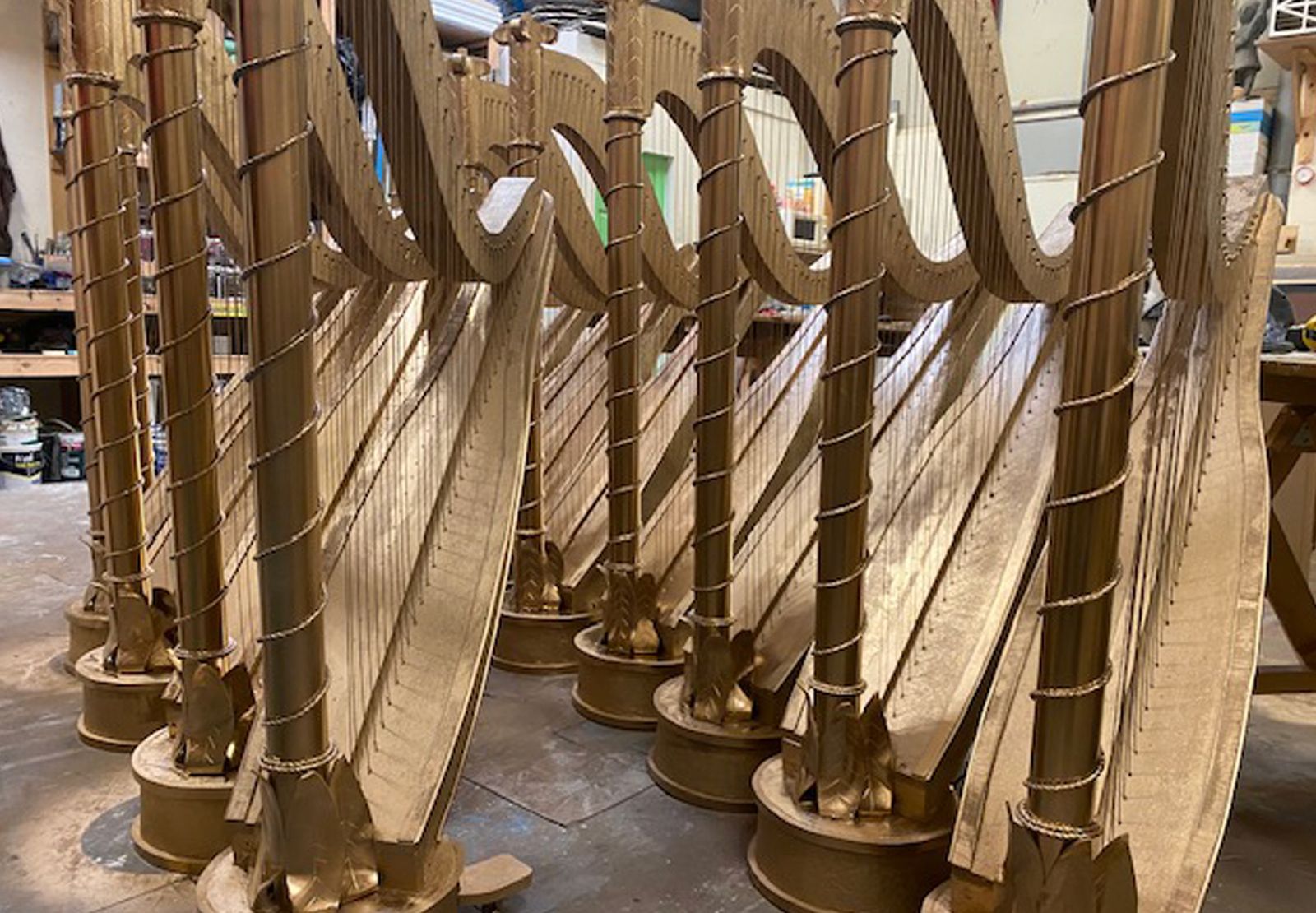 The harps also had to be self-supporting, movable on casters and counterbalanced for stability during on-stage use, allowing performers and crew to reposition them quickly between scenes.